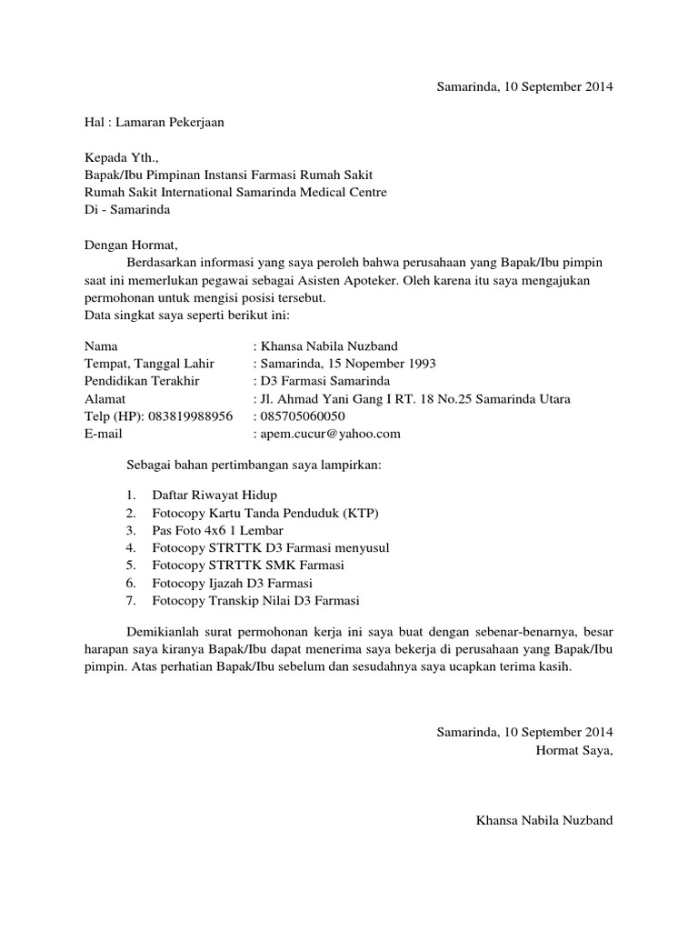 Demikian lamaran yang saya buat ini, saya sungguh berharap bisa diterima kerja di perusahaan yang bapak/ibu pimpin. Contoh surat lamaran kerja di pt sebagai karyawan. Contoh surat lamaran kerja di rumah sakit. Contoh surat lamaran kerja di pt. Ada baiknya untuk menuliskan infomasi tentang pengalaman dan keahlian yang anda miliki agar anda memiliki nilai plus dimata hrd.
